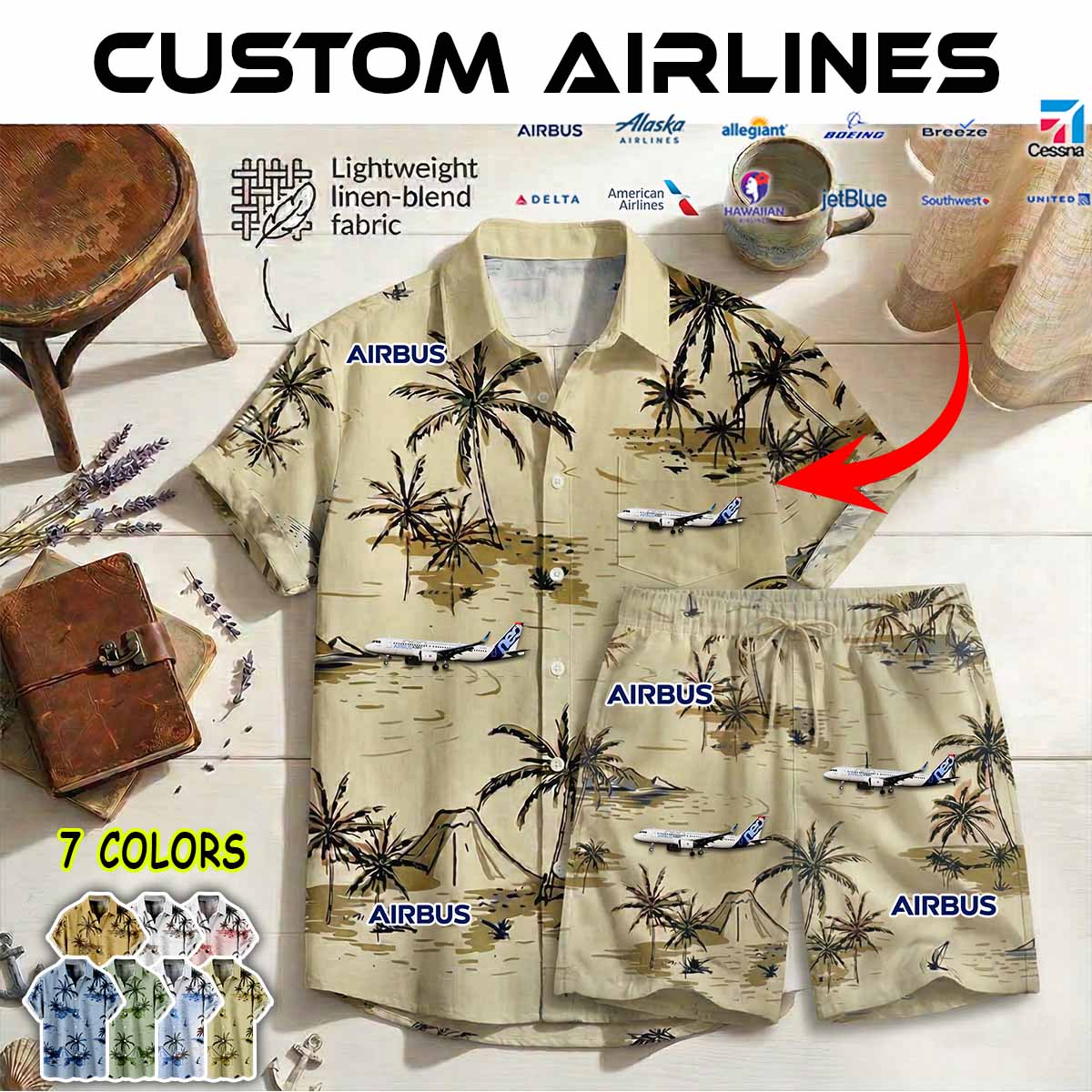 Imagine your airline – whether it’s Delta Air Lines, American Airlines, United Airlines, Southwest Airlines, Alaska Airlines, or JetBlue – proudly displayed on a stylish aviation-inspired linen button-up shirt.