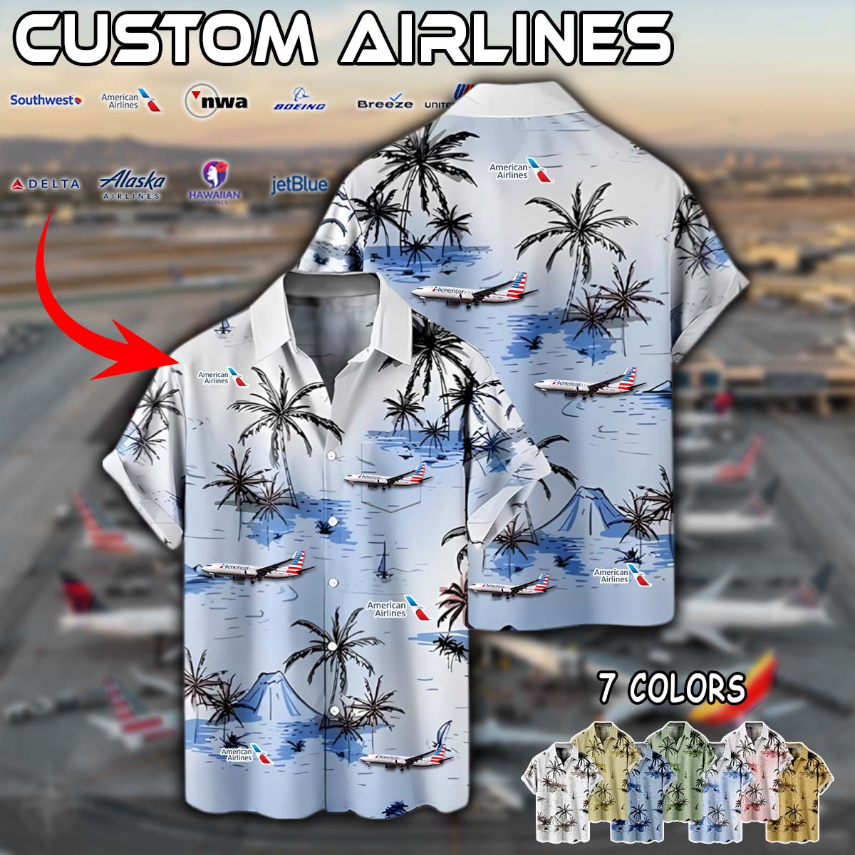 Imagine your airline – whether it’s Delta Air Lines, American Airlines, United Airlines, Southwest Airlines, Alaska Airlines, or JetBlue – proudly displayed on a stylish aviation-inspired linen button-up shirt.