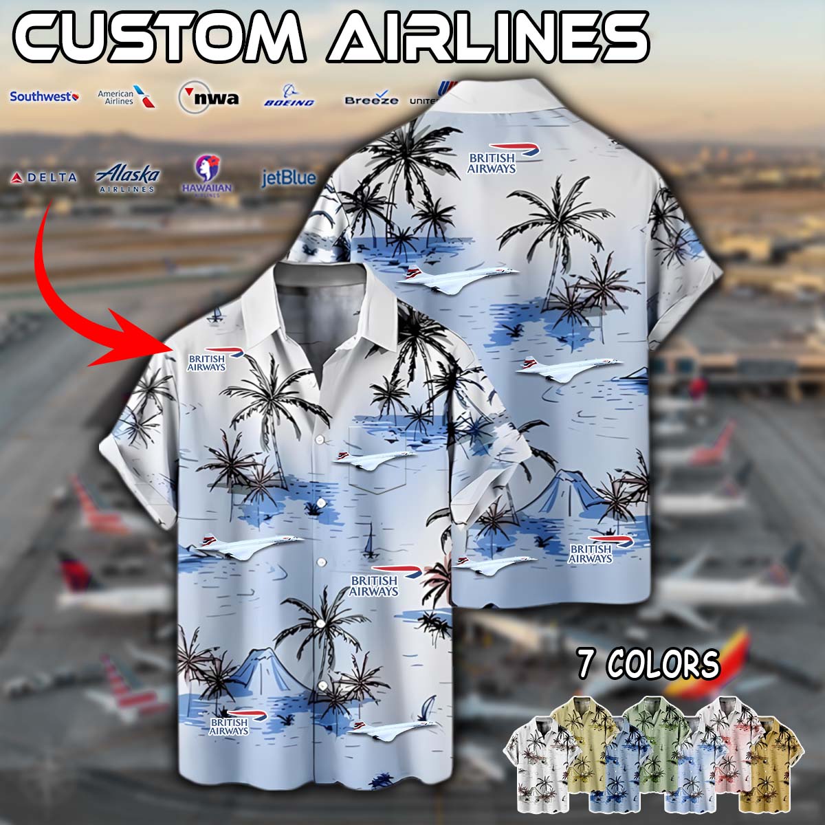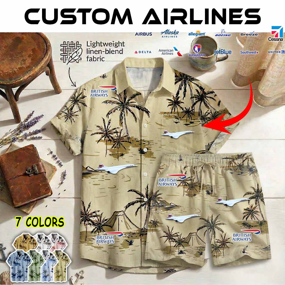 Imagine your airline – whether it’s Delta Air Lines, American Airlines, United Airlines, Southwest Airlines, Alaska Airlines, or JetBlue – proudly displayed on a stylish aviation-inspired linen button-up shirt.
