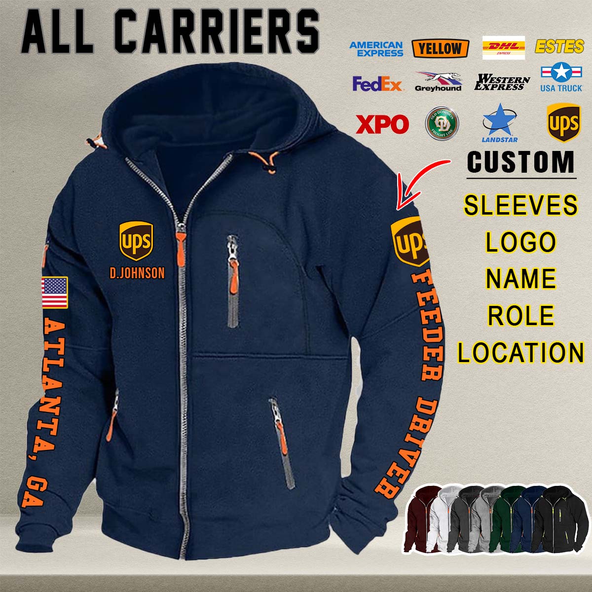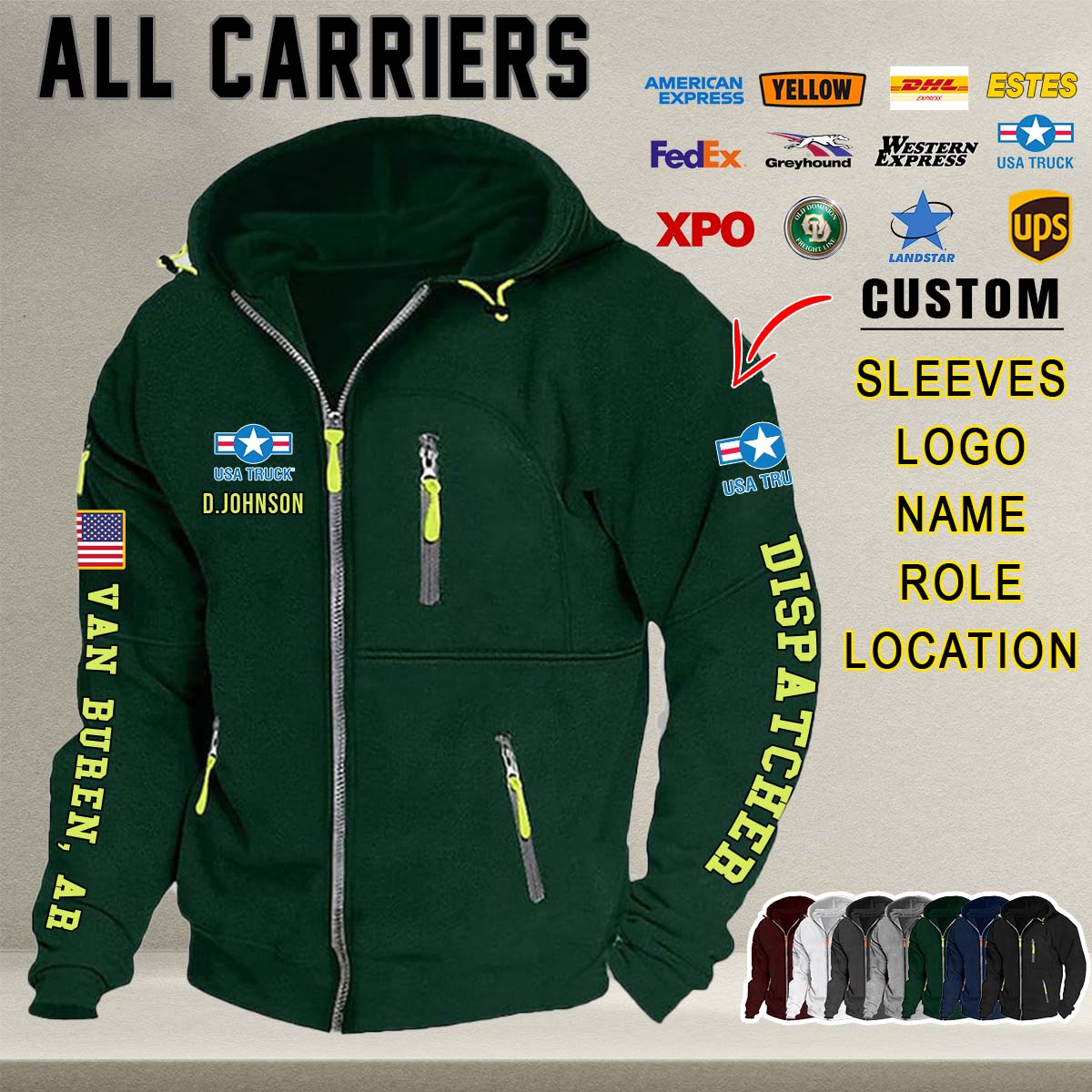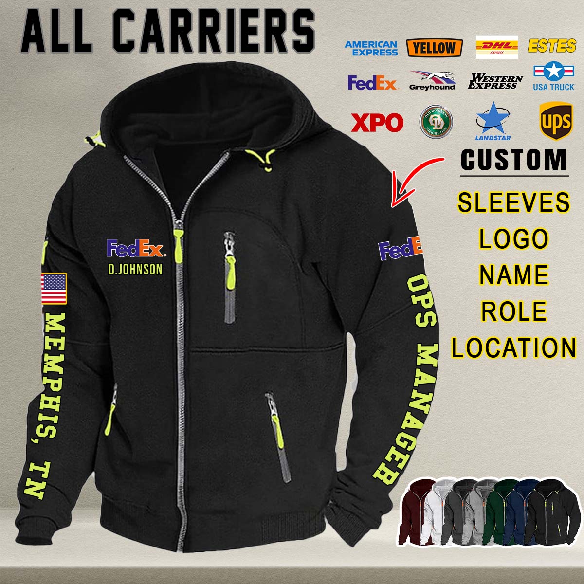 This hooded jacket features an adjustable drawstring hood and four zippered pockets—two side pockets, one chest pocket, and one arm pocket—for secure storage and convenience.