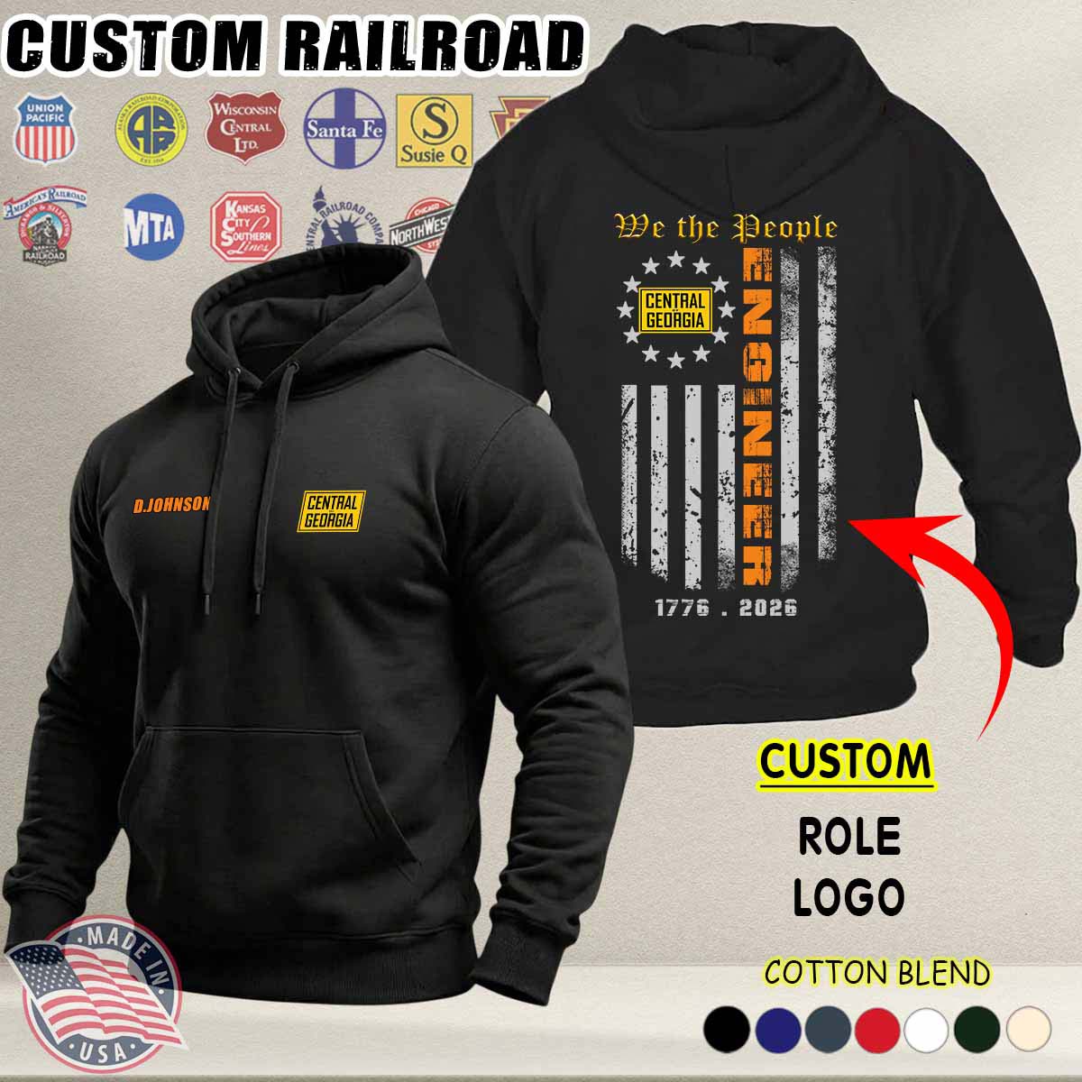 Custom US Railroad_We the People 250 Years of American Ver 2 Cotton Hoodie