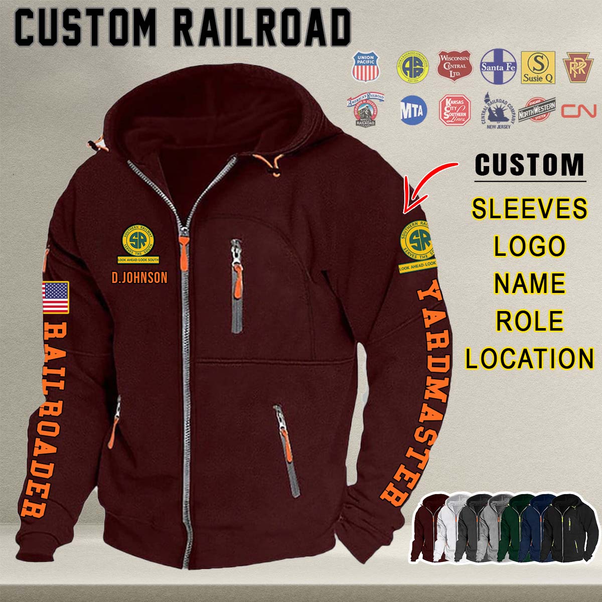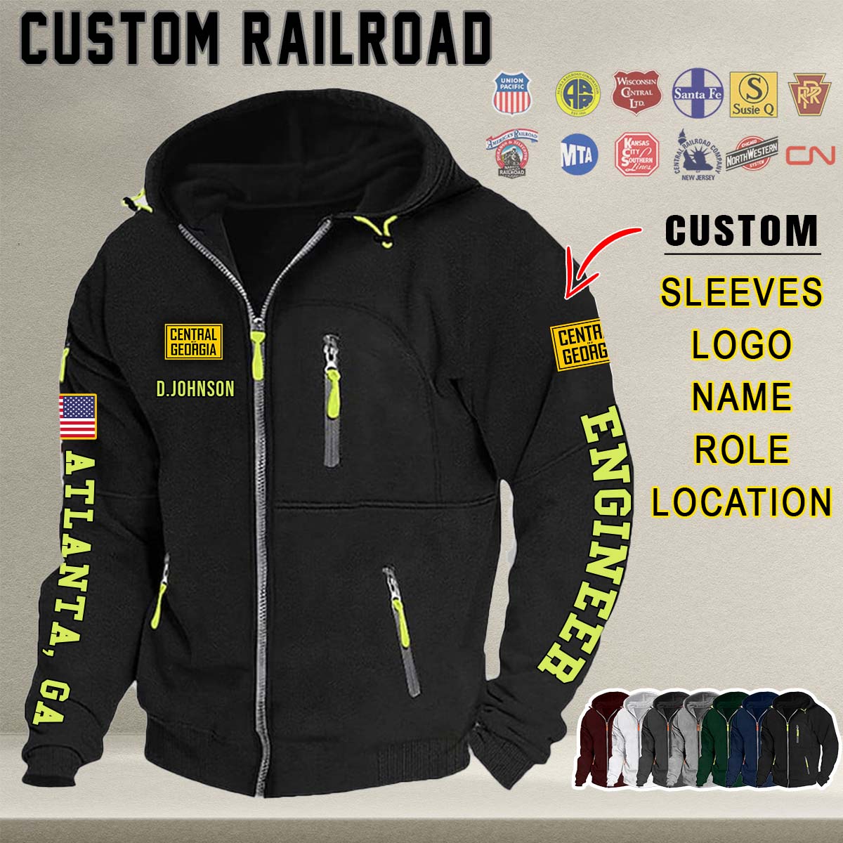 This hooded jacket features an adjustable drawstring hood and four zippered pockets—two side pockets, one chest pocket, and one arm pocket—for secure storage and convenience.