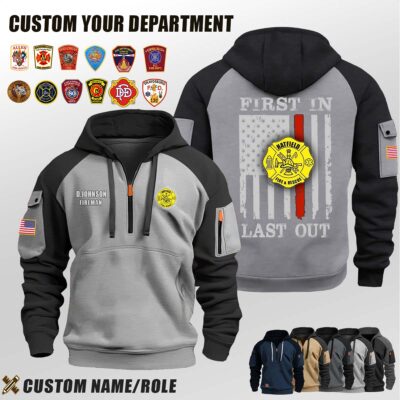 Introducing Hatfield Fire and Rescue WI_First In Last Out Halfzip Hoodie tailored specifically for men who appreciate both warmth and fashion.