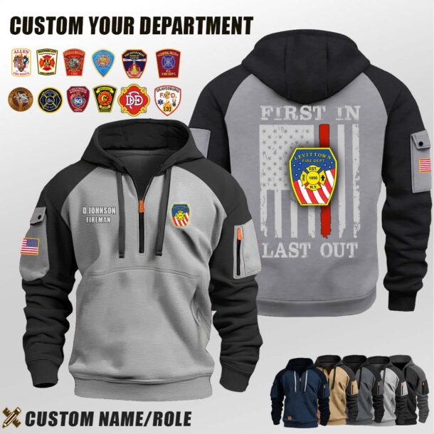 Introducing Levittown Fire Department NY_First In Last Out Halfzip Hoodie tailored specifically for men who appreciate both warmth and fashion.