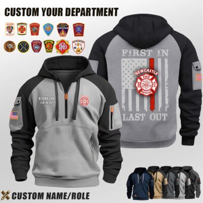 Introducing Newcastle Fire and Rescue Department NE_First In Last Out Halfzip Hoodie tailored specifically for men who appreciate both warmth and fashion.