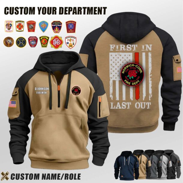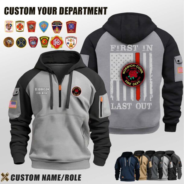 Introducing Norwich Volunteer Fire CT_First In Last Out Halfzip Hoodie tailored specifically for men who appreciate both warmth and fashion.