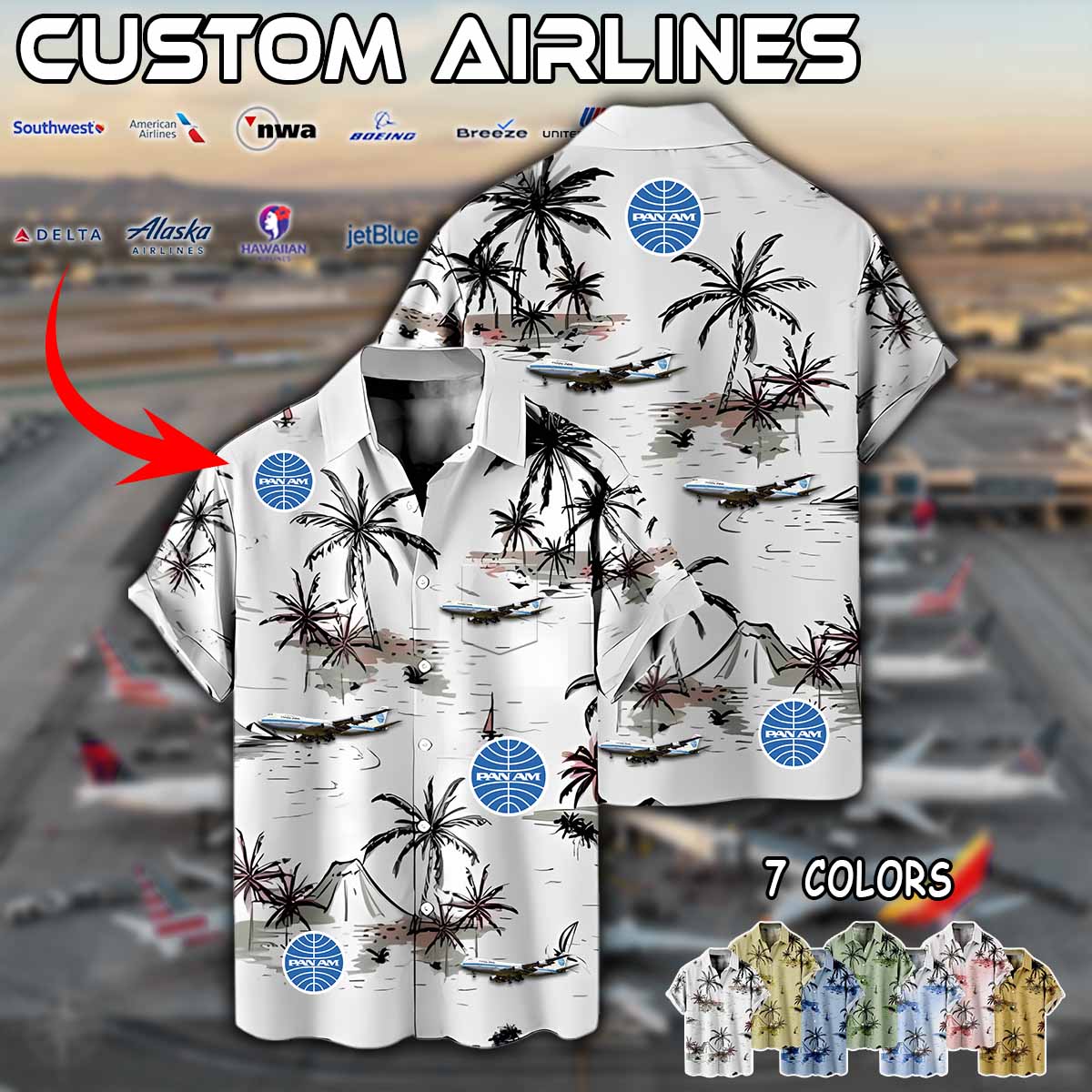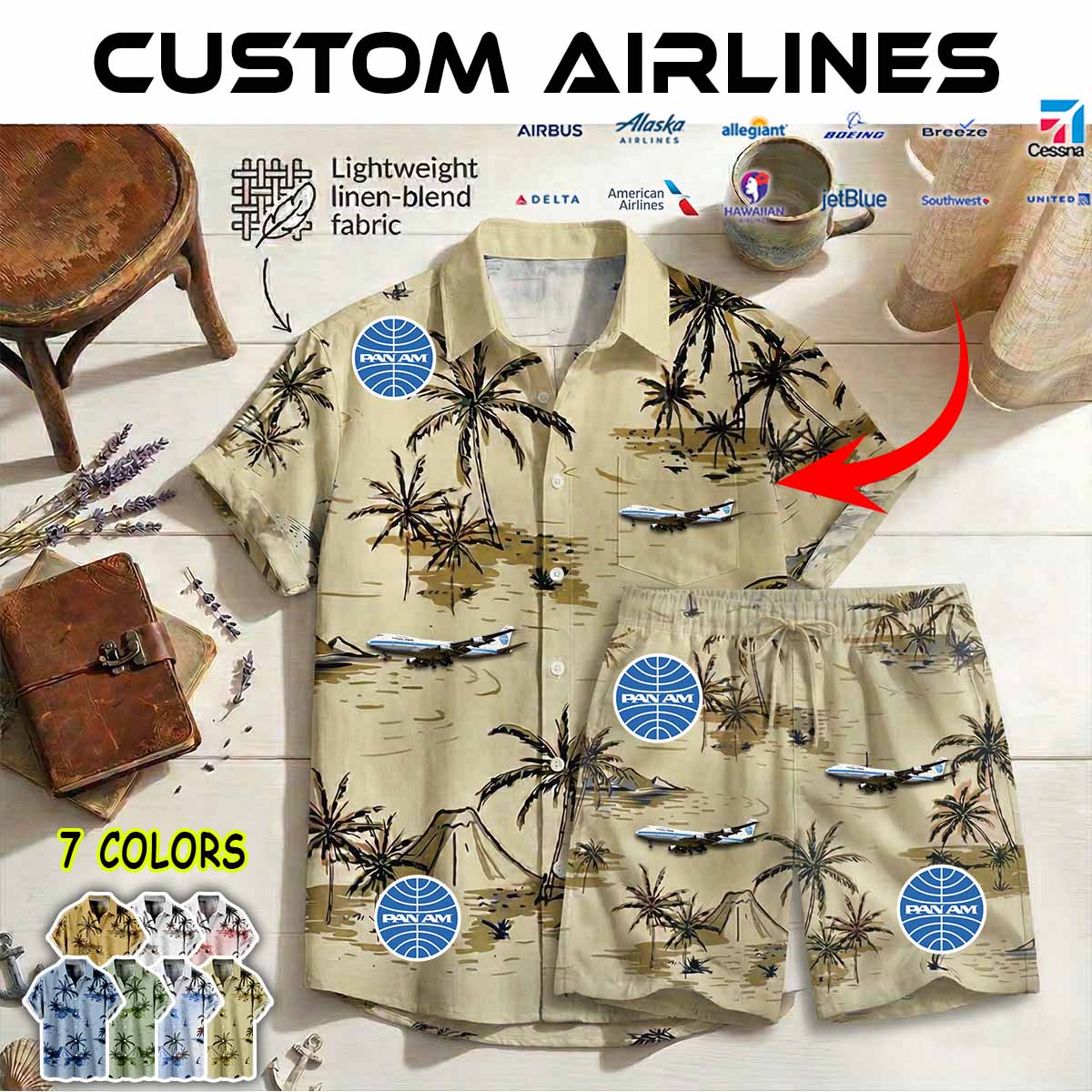 Imagine your airline – whether it’s Delta Air Lines, American Airlines, United Airlines, Southwest Airlines, Alaska Airlines, or JetBlue – proudly displayed on a stylish aviation-inspired linen button-up shirt.