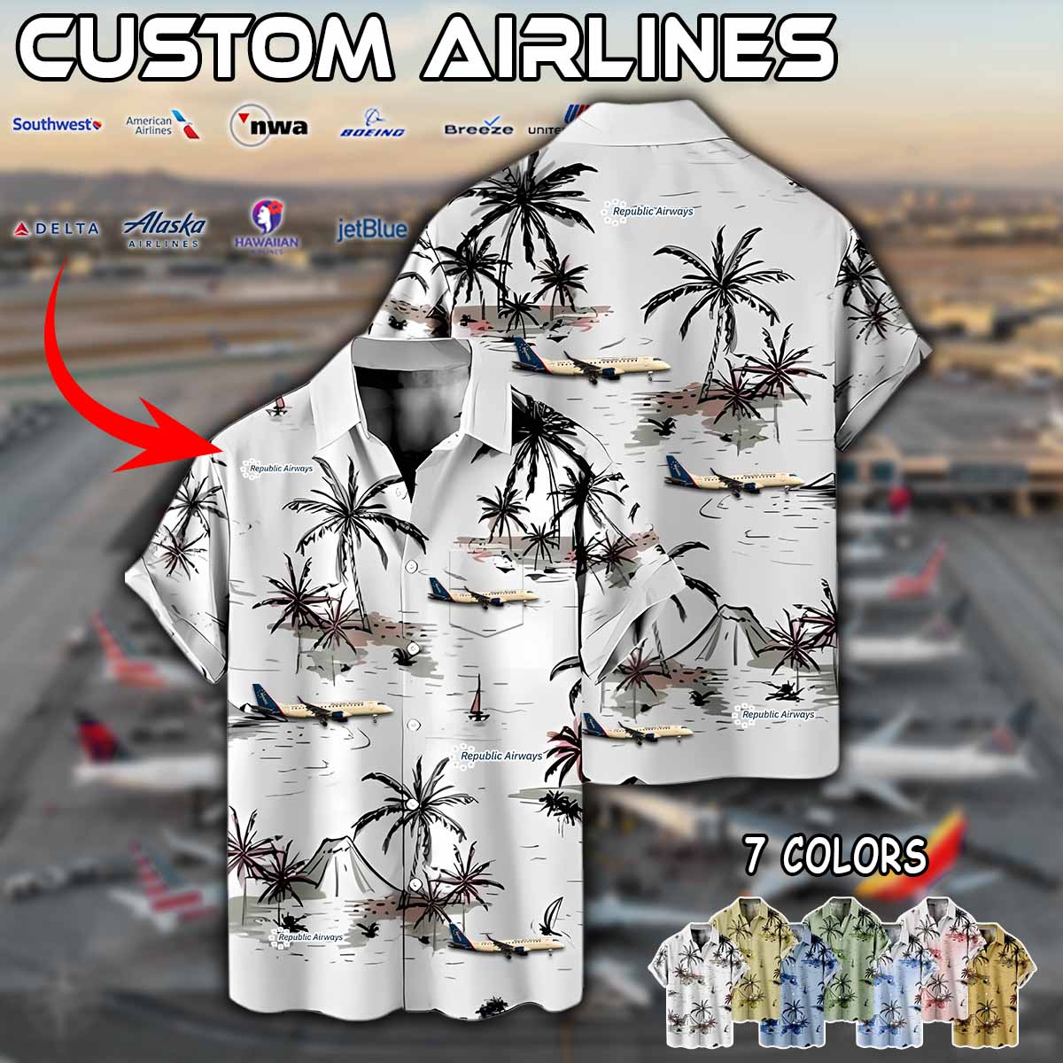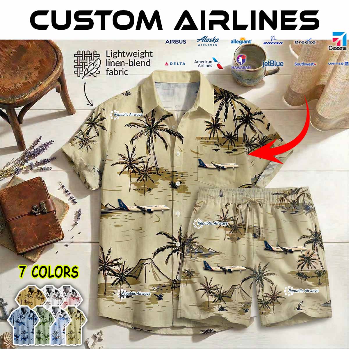 Imagine your airline – whether it’s Delta Air Lines, American Airlines, United Airlines, Southwest Airlines, Alaska Airlines, or JetBlue – proudly displayed on a stylish aviation-inspired linen button-up shirt.