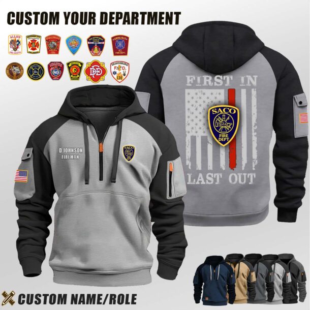 Introducing Saco Fire Department ME_First In Last Out Halfzip Hoodie tailored specifically for men who appreciate both warmth and fashion.