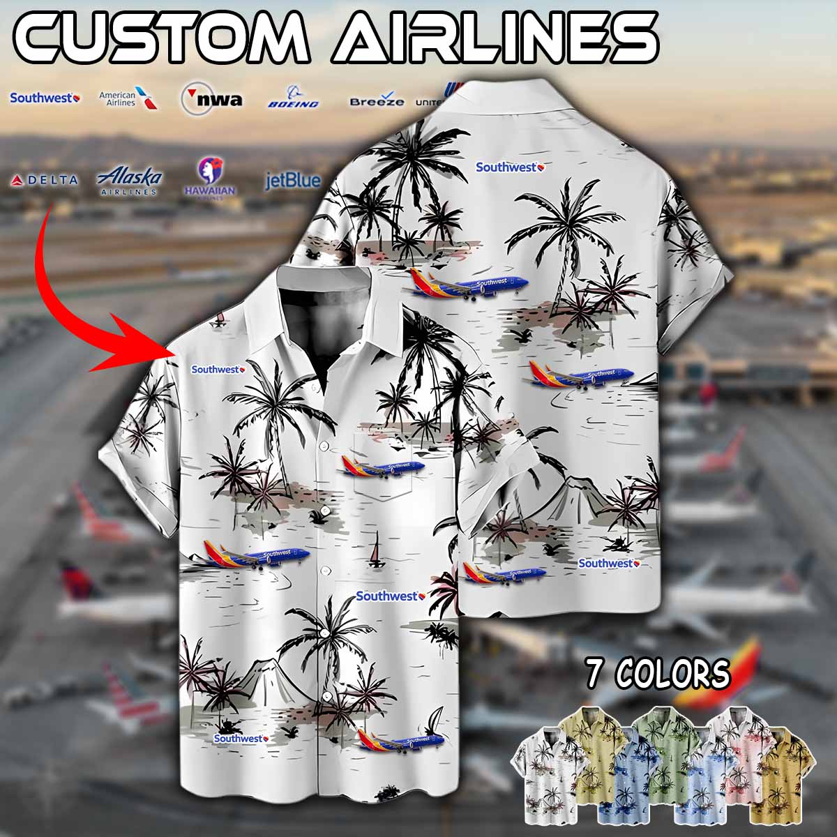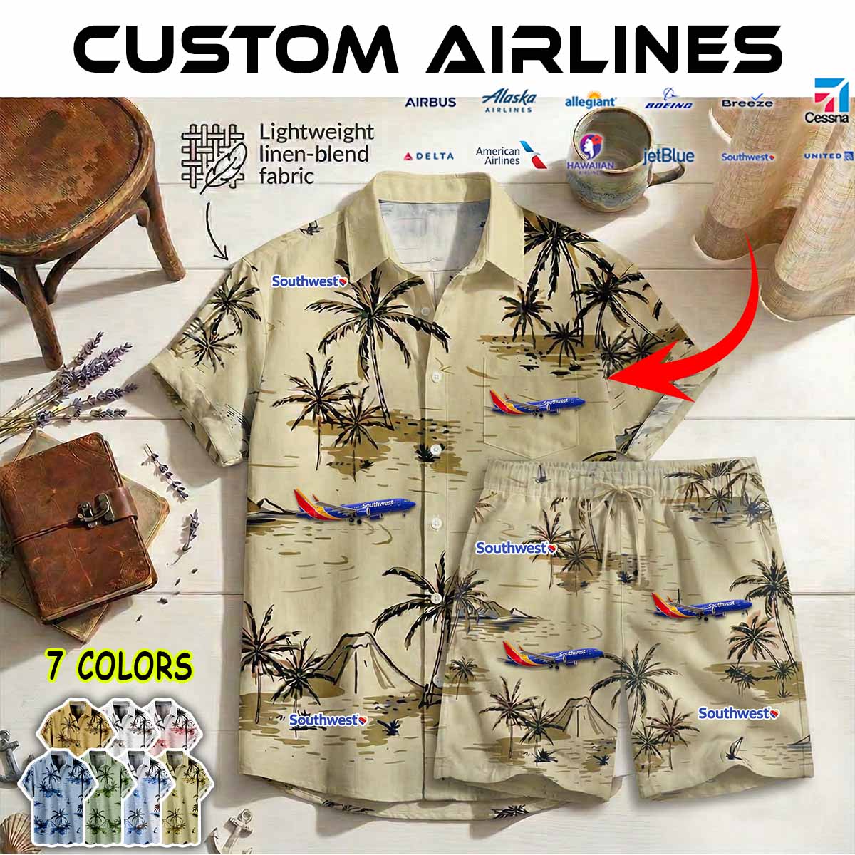 Imagine your airline – whether it’s Delta Air Lines, American Airlines, United Airlines, Southwest Airlines, Alaska Airlines, or JetBlue – proudly displayed on a stylish aviation-inspired linen button-up shirt.