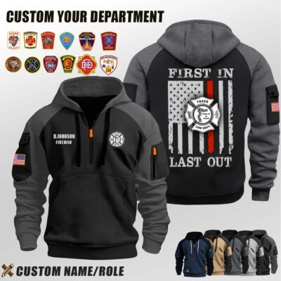 Introducing Traer Fire Department IA_First In Last Out Halfzip Hoodie tailored specifically for men who appreciate both warmth and fashion.