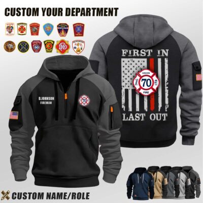Introducing Union Fire Protection District IL_First In Last Out Halfzip Hoodie tailored specifically for men who appreciate both warmth and fashion.