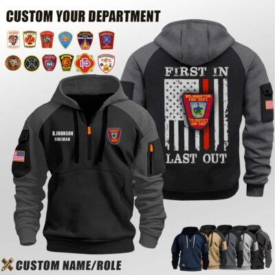 Introducing Wilmington Fire Department VT_First In Last Out Halfzip Hoodie tailored specifically for men who appreciate both warmth and fashion.
